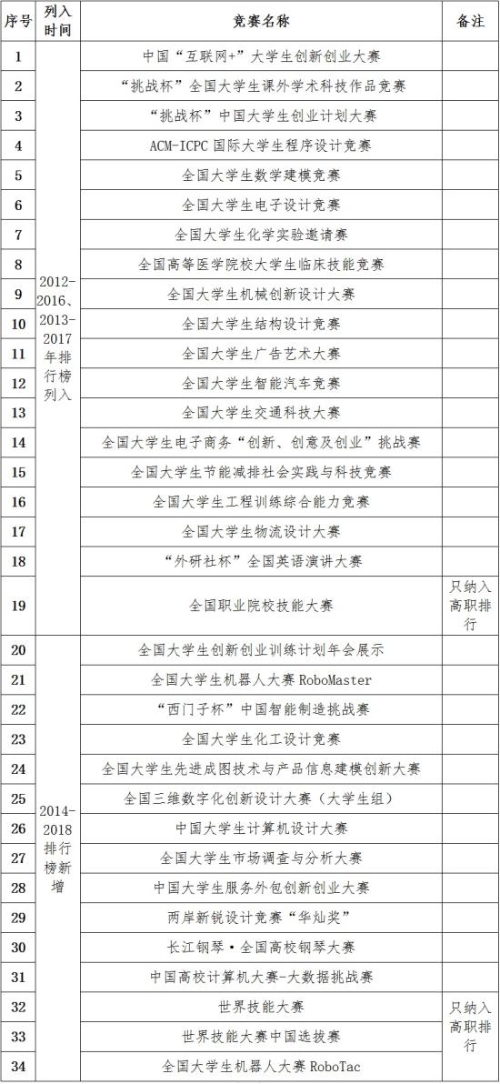 据悉,中国高等教育学会于2017年12月、2018年2月分别发布了2012-2016年、2013-2017年我国普通高校学科竞赛排行榜。排行榜为高校提高人才培养质量提供服务性参考信息,为进一步规范管理、推动和发挥学科竞赛类活动在教育教学、创新人才培养等方面的重要作用,提供了规范和引导。迄今,总共发布了三届。