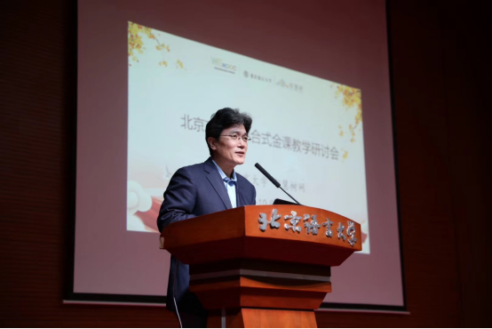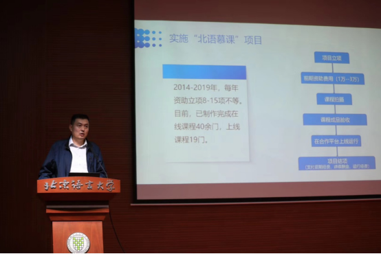 教务处副处长王瑞烽做了主题为“北语在线开放课程的建设与应用”的报告。报告中回顾了北语自2013年以来在线开放课程建设与应用的开展情况,并对未来提出了四点展望。