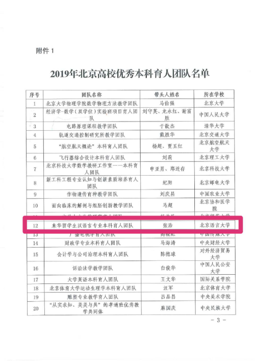 12月30日,北京市教育委员会公布2019年“北京高校优秀本科育人团队”和“北京高校优秀本科教学管理人员”遴选结果,我校来华留学生汉语言专业本科育人团队荣获“北京高校优秀本科育人团队”称号,