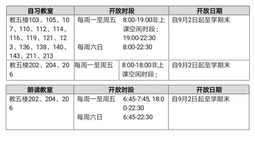 教一楼(8层机房及智慧教室除外)、教四楼、教五楼(4层机房除外)、主楼南、逸夫楼教室,周一至周五白天开放时间为7:30—18:30。
