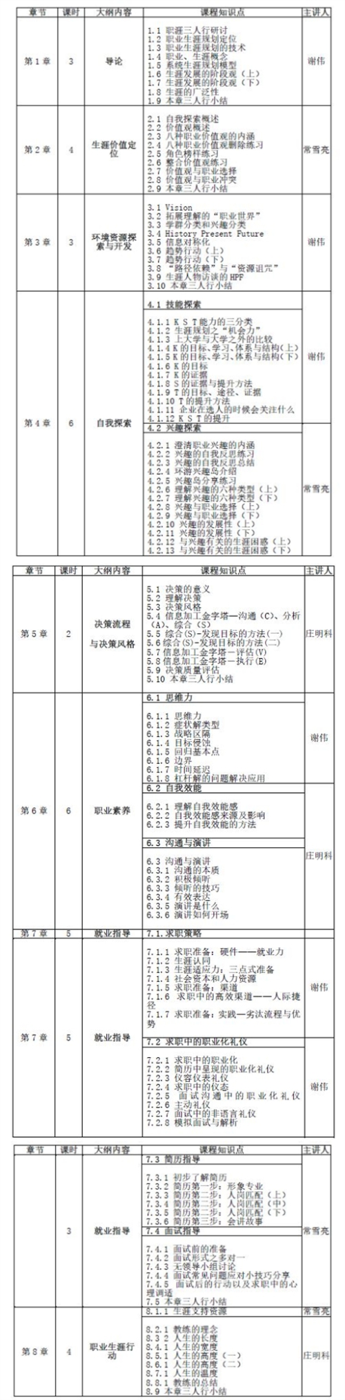 本课程为公共必修课,1学分,采用慕课的形式进行。课程主要介绍大学生自我探索、职业探索、职业素养、求职指导和职业生涯行动等内容,帮助学生获得解决职业生涯困惑的思维方法,学会如何澄清自己的内心需求,如何在十字路口做出正确选择,为理想的职业生涯发展做好准备。